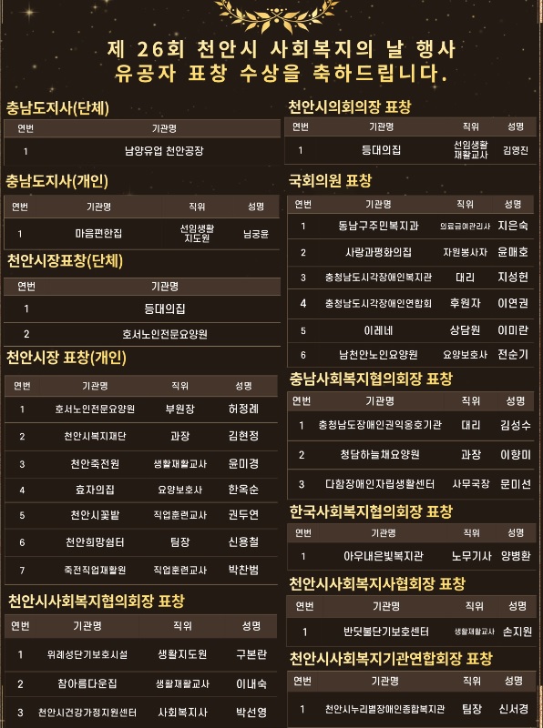 제 26회 천안시사회복지의 날 행사 유공자 표창수상 페이지 정보 작성자작성자 : 천사협 조회조회수 : 1,188회 작성일작성일 : 25-09-23 13:14 본문 수상을 축하 드립니다! 목록 이전글2025년 법인 정기 이사회의(2차) 개최 25.03.11 다음글「제26회 천안시사회복지의 날 행사」사회복지 유공자 추천 협조 요청 25.07.28